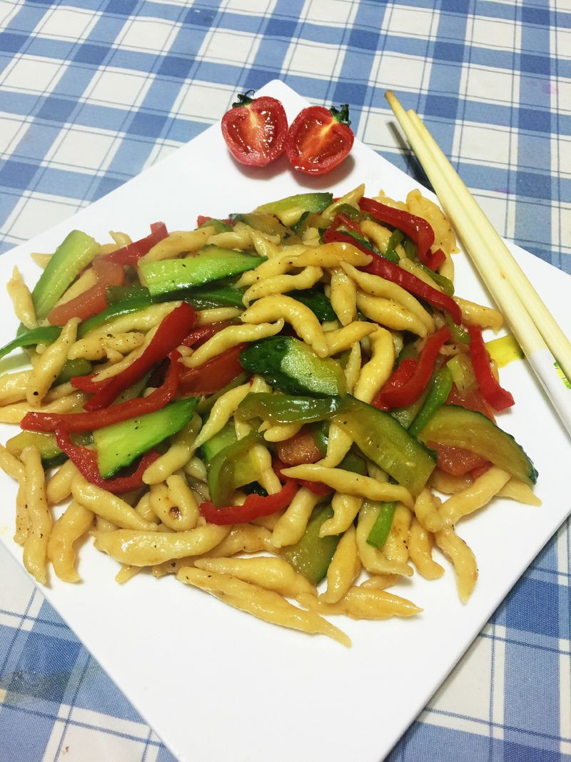 搓鱼子,可以炒出不同口味的,番茄鸡蛋、青椒肉丝的都可以,爱吃什么样的,炒即可!“小鱼儿”搭配什么菜都好吃呢!