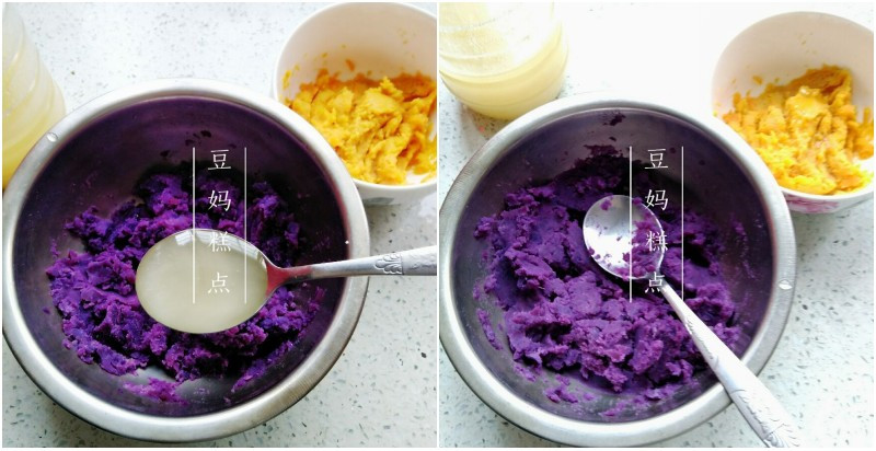 豆妈说:这实在是相当简单的一款小点心了,食材常见,做法更是简单,外形却很漂亮,至于口感,喜欢吃紫薯或者红薯的不能错过,不喜欢的,额,就看着家人吃吧!像我们家的,豆丁不爱吃,先生感觉一般,我却是极喜欢,婆婆只喜欢红薯的,公公却又比较喜欢紫薯的,哈,还真是众口难调啊!