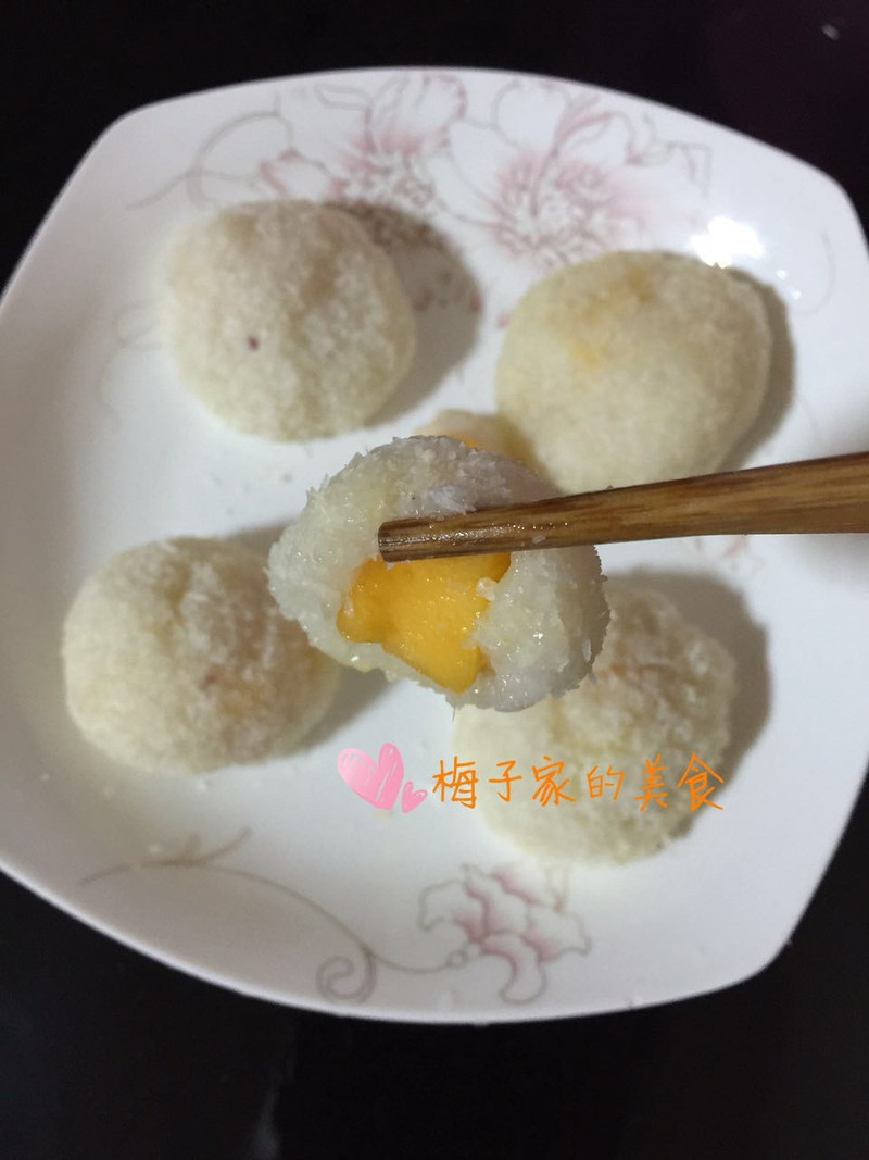 食材:糯米、芒果、椰丝。 步骤:1.糯米浸泡十个小时以上,将水分沥干,放入蒸笼蒸三十分钟。为防止糯米太硬,期间可每隔七八分钟打开锅盖在糯米上洒点水。2.蒸好的糯米晾凉,用果语原汁机上冰淇淋头摇成泥,摇的时候可将料筒、螺旋杆、冰淇淋头打湿,这样糯米不容易粘住。3.将切好的芒果块包入糯米泥里,滚圆,粘上一层椰丝,即可食用。