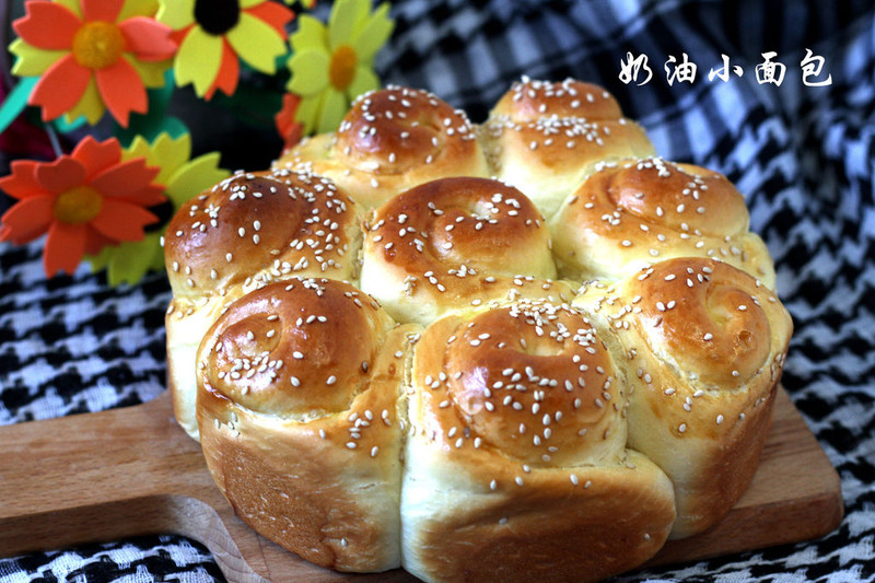 这款面包是前几天做的了,正好家里有开了封的淡奶油,要尽快用掉,所以就揉了面做了这个奶油小面包,放在圆形的蛋糕模具里,发酵好之后挤的满满的,刷上蛋液撒上熟芝麻,烤箱烘烤之后取出来,女儿很夸张的惊叫:妈妈,你做了一朵花啊!!四岁半的小姑娘正是爱花的年龄,也毫不掩饰自己对妈妈的爱,没事就喜欢趴在我耳边说:妈妈,你做的蛋糕和面包比外面买的好吃!!或者就是简单的几个字:“妈妈,我爱你!”这嘴甜的肯定是遗传我了,她爹都从来没如此表白过!!做好的面包放凉后装保鲜袋封上口,在袋子里会回软,吃的时候可以热一下也可以不用热,随各人喜好。带孩子去公园玩的时候带上一袋也是挺不错的,所以没事我就做一盘,冰箱里冷冻着,以备不时之需。