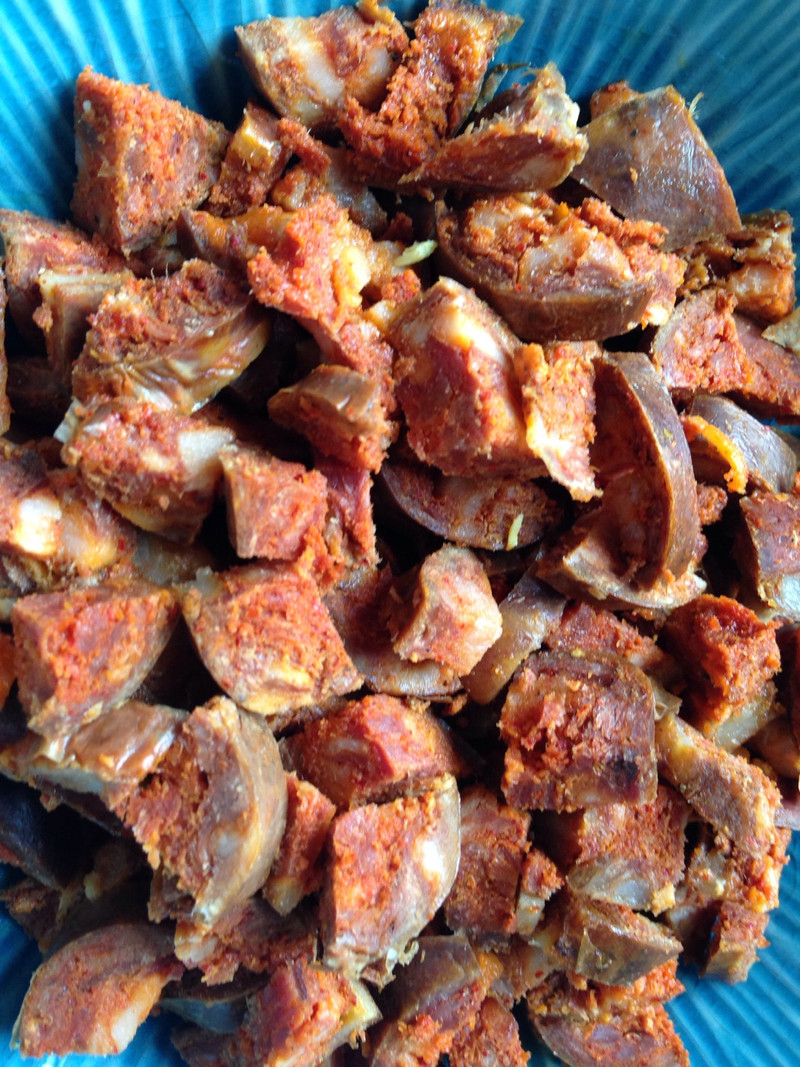 随心所欲家常菜(香肠杂酱)冬天的香肠还没吃完,有点愁,为了消耗掉,仿照XO酱的做法,做了这道香肠杂酱。把瑶柱、干虾仁洗净上笼蒸20分钟,然后切碎,煮熟后的香肠切成颗粒状,香菇切碎,洋葱切成小丁,备葱、姜、蒜、干辣椒,锅中将油烧热后,加入干辣椒爆香,然后将切碎的瑶柱、虾仁下锅翻炒,同时加入葱、姜、蒜和香菇翻炒,在香菇的水份炒出后,加入洋葱和香肠,用小火炒到杂酱油亮时就好了。川味香肠本身的味道已经够了,不需要再加其他调味料,为了调和酱的盐味,可以加少许白糖。炒好的杂酱咸味合适,香肠柴的口感已变成焦香,回味中的海鲜味增加了杂酱的档次和品质,用它配粥吃或拌面、拌饭一定都会很搭的。