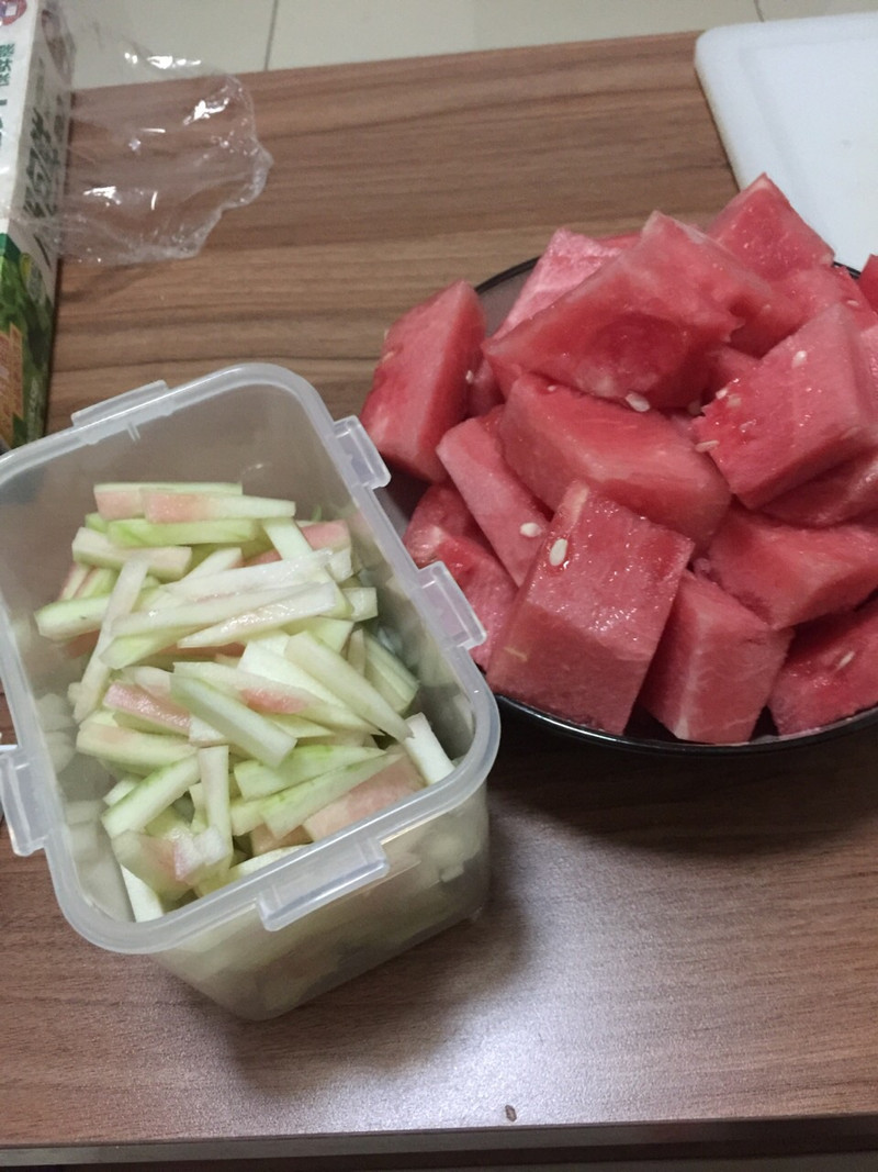 西瓜皮去硬皮是细致活,切小块去皮比较容易