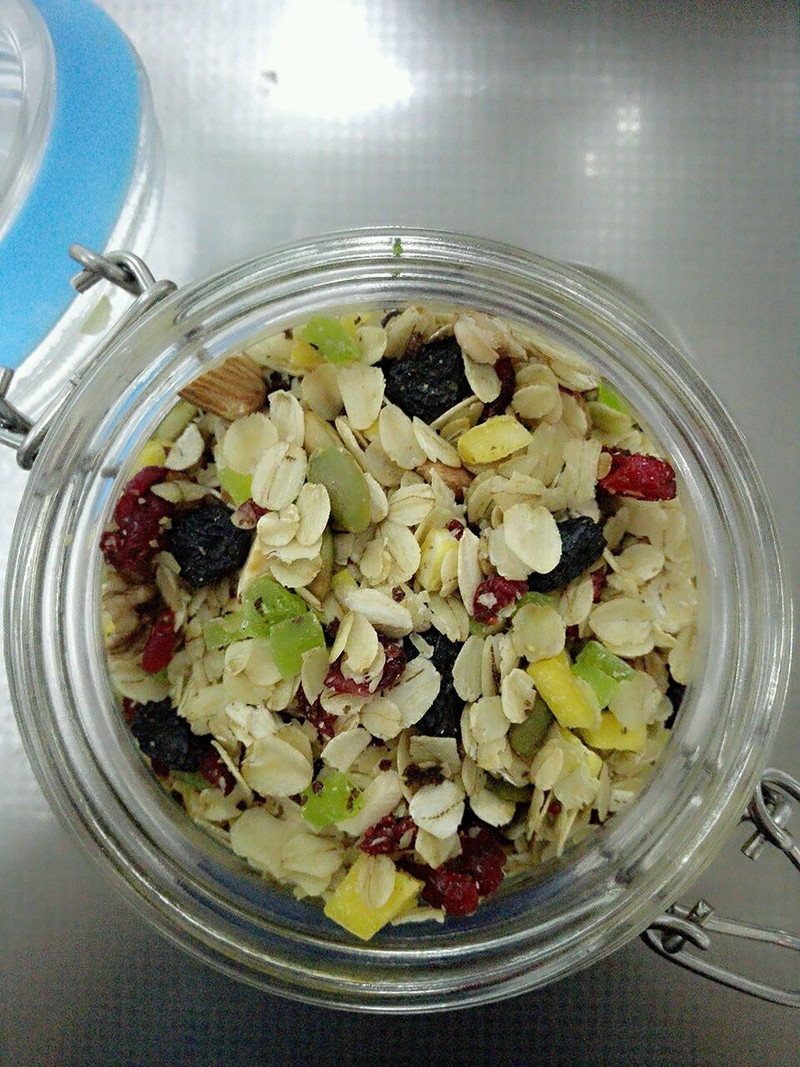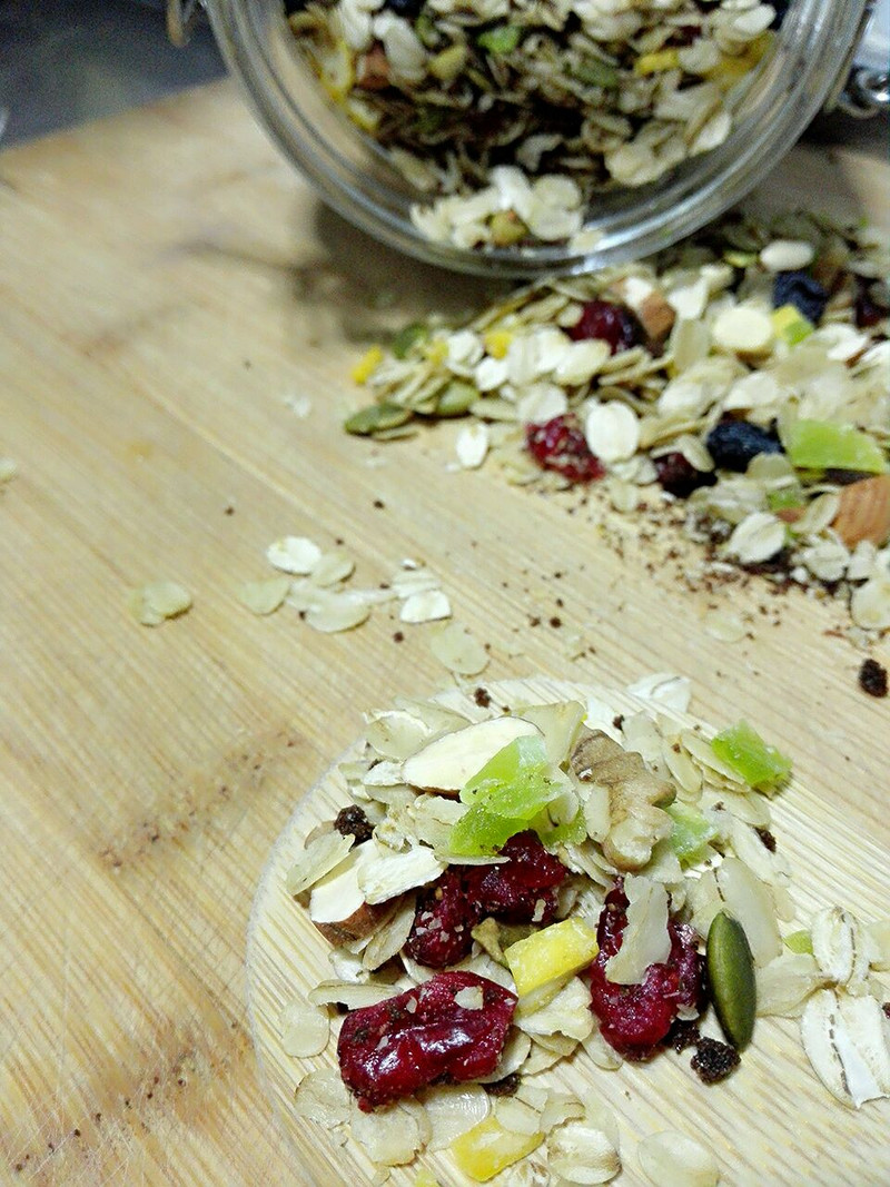家里的核桃就剩这么多了,干果类可以根据自己的喜好添加。由于我果脯放的比较多所以没加蜂蜜和麦芽糖。加麦芽糖和蜂蜜会略微结块。个人还是喜欢干干的感觉。