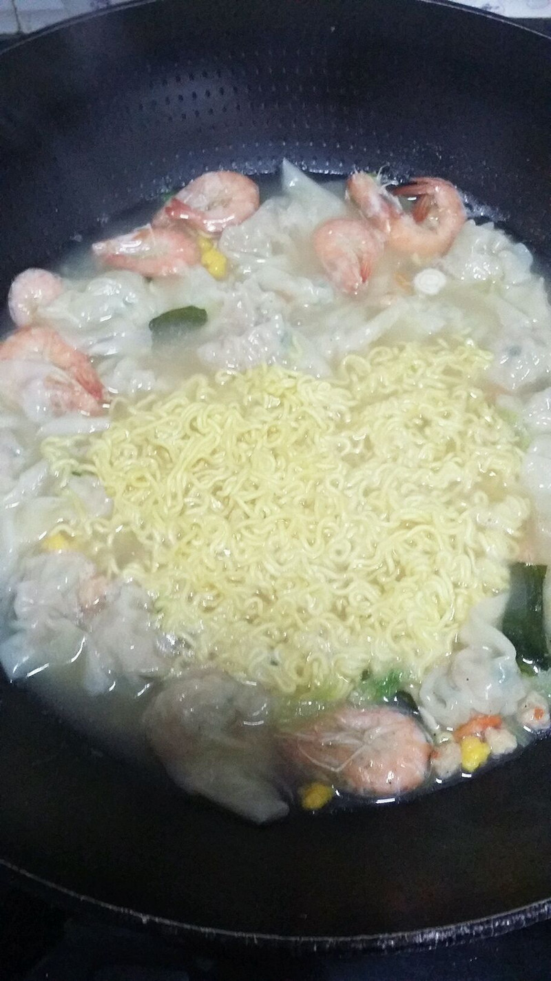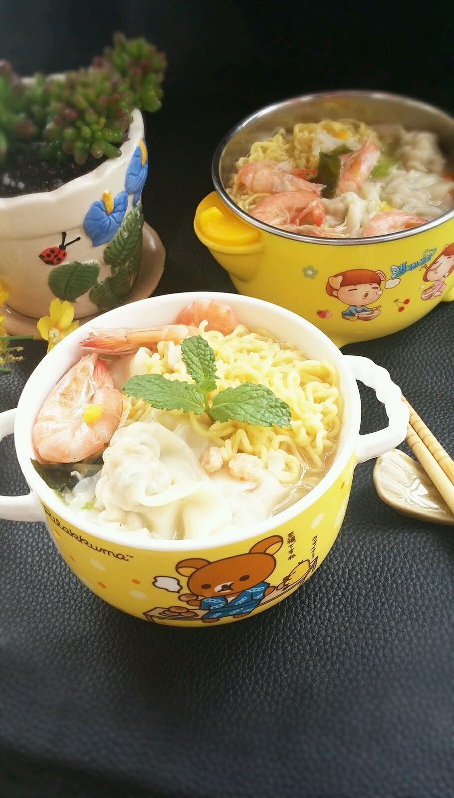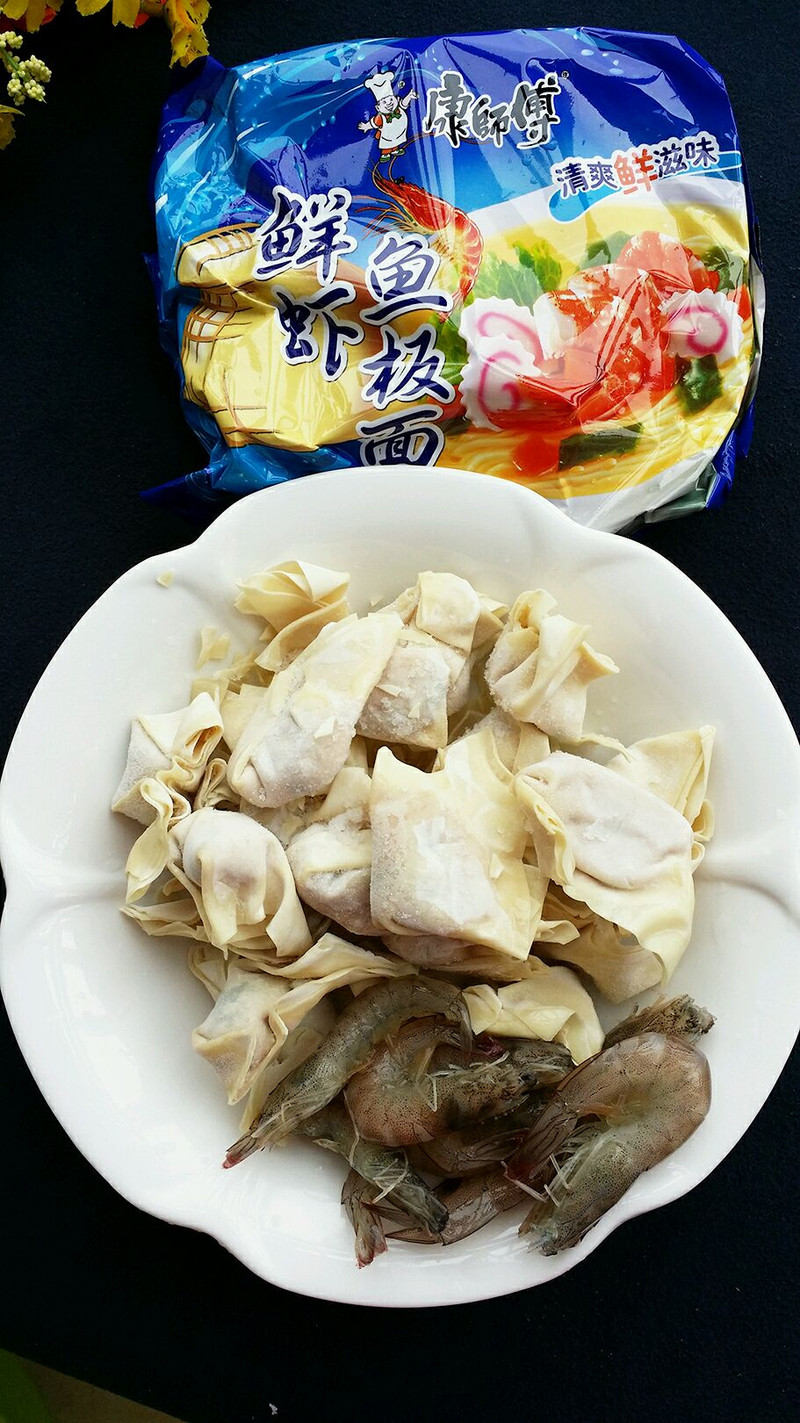 今天早上落雨,没有去买菜,在冰箱看看,有虾,有云吞,家里有泡面,那么做一个鲜虾云吞面,没有想到味道那么好,多亏了康师傅鲜虾鱼板面,味道真的好棒,好鲜。