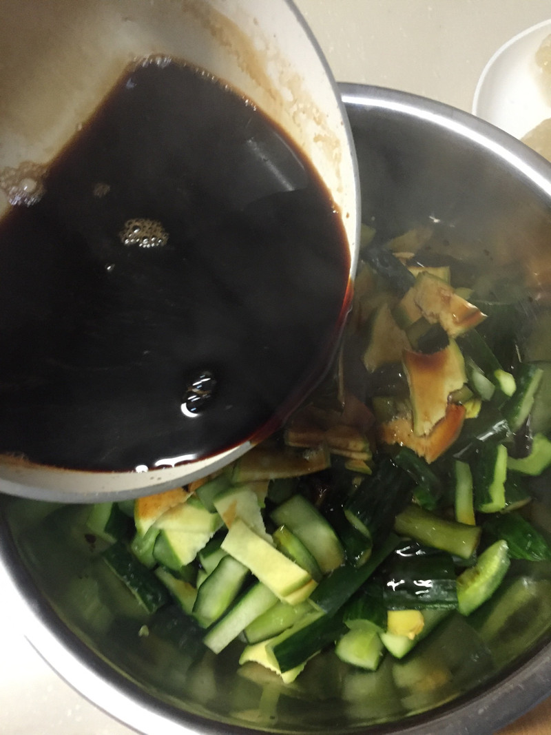 酱油用的是生抽,冰糖用的是老冰糖;酱油煮三次主要的原因是把黄瓜里腌出来的水蒸发掉;冰糖一定要完全化掉在酱油里才可以倒入黄瓜一起。