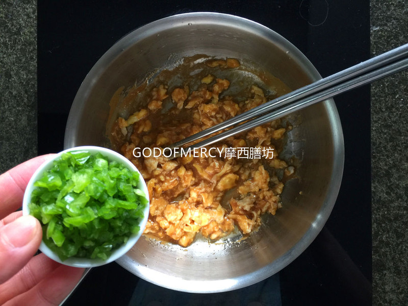 7.鸡蛋酱也可以加入肉,味道很香。如果不喜欢青椒,可以放入大葱 。