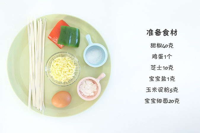 ●如果宝宝的咀嚼能力较弱,可以将面条掰碎后再做这道辅食。如果没有甜椒的话,也可以用其他蔬菜代替。