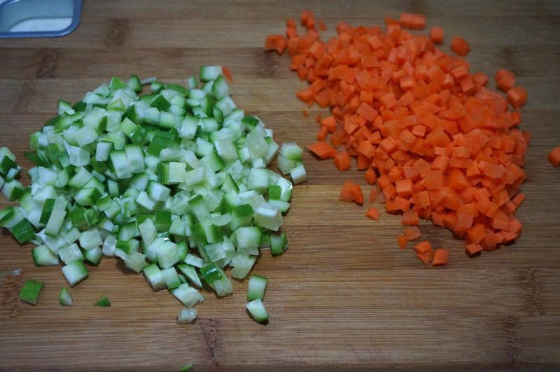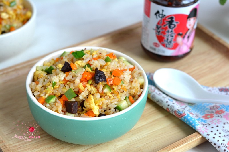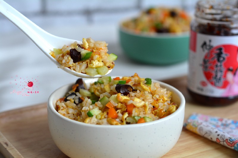 米饭入锅前能用筷子打散最好,这样受热均匀,剩米饭一定要加热充分再吃,否则冰箱里的细菌会因加热不够而导致肠胃炎; 油不要太热时倒入鸡蛋液,用筷子快速打散,这样的鸡蛋块细小而均匀; 胡萝卜丁不易熟,所以要先下锅中翻炒到半熟; 香菇酱的多少随个人的口味来增加,因为香菇酱是咸的,所以盐要酌量加入。