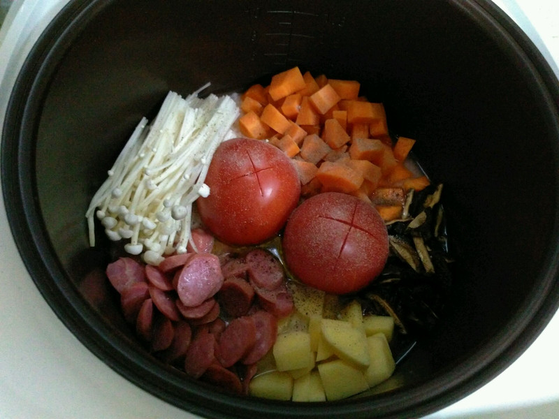 米里放点油,煮出来的饭蓬松很香。除了蔬菜,最好放一样荤菜,荤素搭配营养合理也更美味!