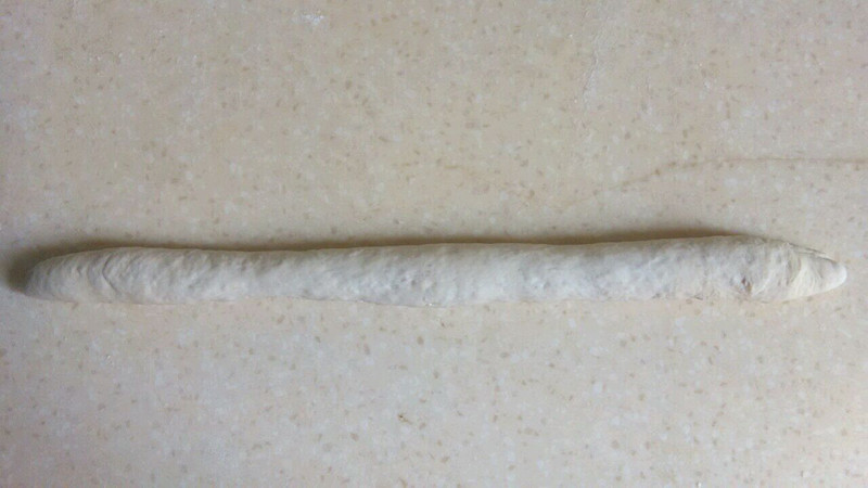 然后用擀面杖将每个面团压成椭圆的薄片,彻底排气。随后从一端到另一端紧紧卷成一个长条,继续搓长至20厘米。
