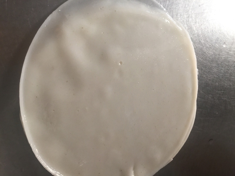 将披萨盘抹油,放两勺米浆,转动一圈披萨盘使米浆均匀,将披萨盘放入烧开后的锅内蒸1分半左右,待米皮表面起泡即熟