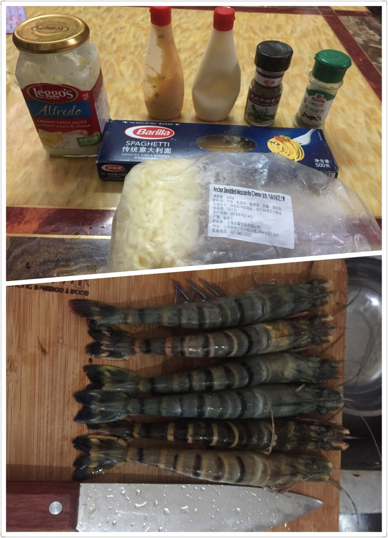 芝士焗大虾&奶酪酱意粉:材料有 大海虾我一般选用50--60克一只的, 鲜香菇,意大利奶酪酱,意大利面,丘比特沙拉酱2种口味,什锦香草碎,黑胡椒粉,马苏里拉芝士,和一些自己装盘用的花草,我的是在自家花园摘的···