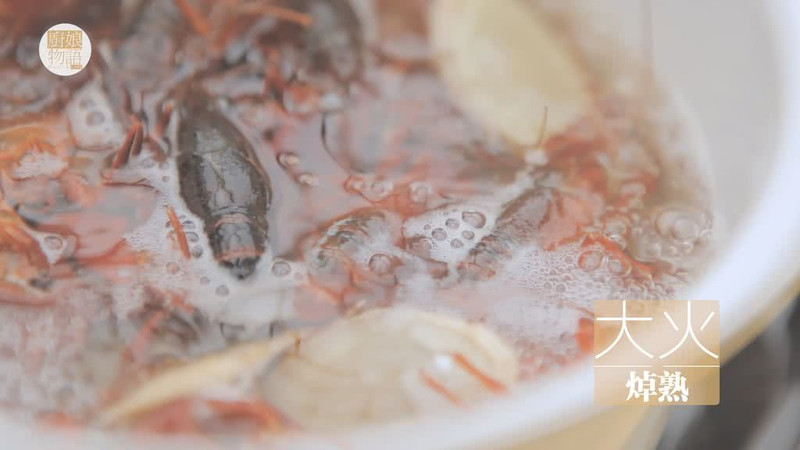 水中放入3片姜,5ml料酒,500g小龙虾焯熟。