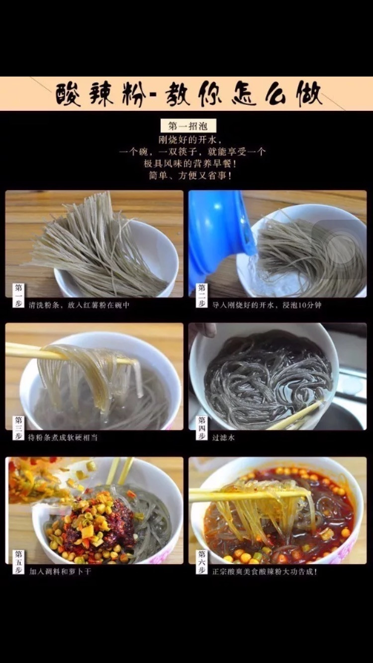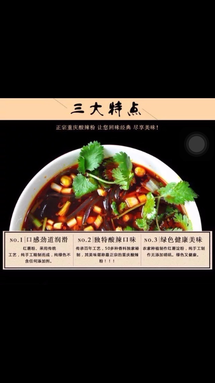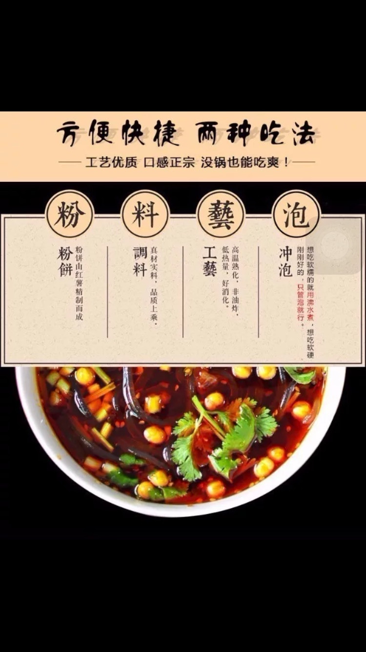 新鲜现做湿粉,不用提前浸泡,烫热就能吃,超方便! 酸辣粉是重庆市、四川省、贵州省等地的汉族传统特色先吃,属于渝菜、川菜、贵州小吃。 其特点是麻、辣、鲜、香、酸且油而不腻。 酸辣粉主粉由红薯、红苕、豌豆按比例调和,然后由农家用传统手工漏制而成。 酸辣粉源于西南民间,取食材至当地手工制作的红薯粉,味以突出酸辣为主而得名。