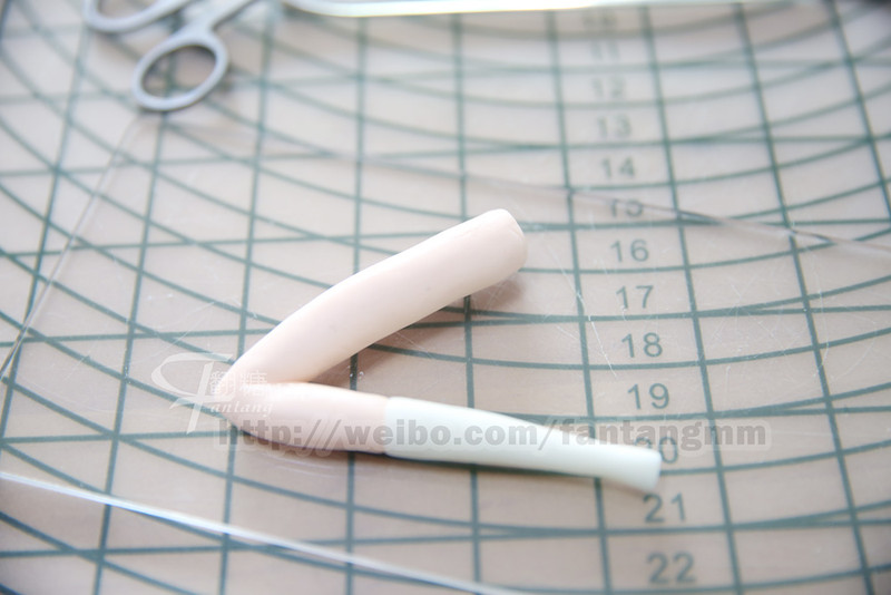 下面制作手,手上戴有手套,所以取白色翻糖,用主刀压出拇指,用剪刀剪开其余四指