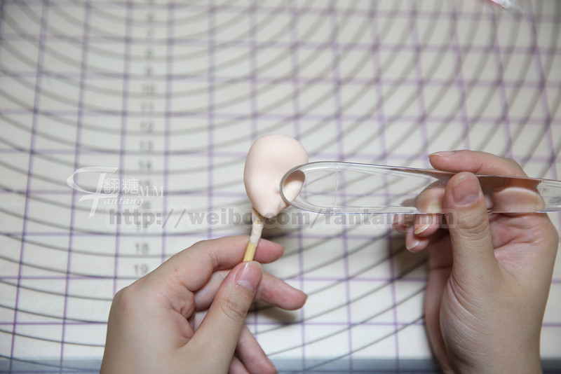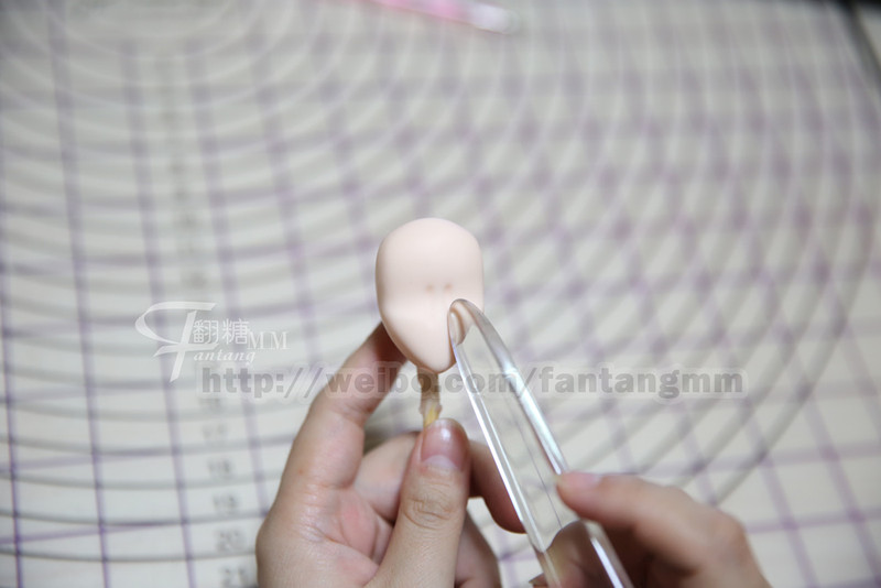1. 翻糖人偶手工开脸,首先染色肉色翻糖膏,在筷子上捏出一个头部形状