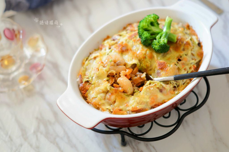 虾仁搭配的正餐,营养更加丰富。虾仁与芝士的结合,除了披萨,咱还可以来试试焗饭哦。满满一口有大大的爽滑虾仁,还有已与芝士融合一起的几种蔬菜和米饭,那就是一个字:满足!