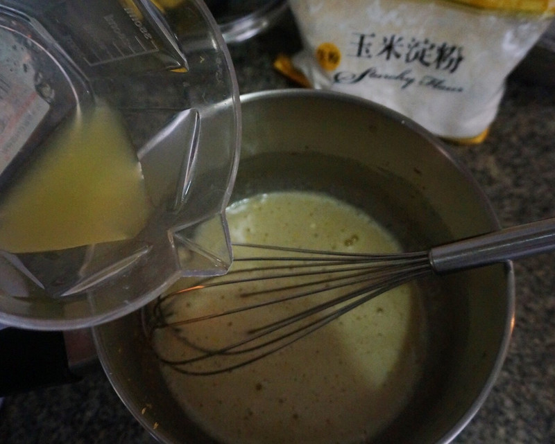 在锅子里加入鸡蛋打散,玉米淀粉与细砂糖混合后,倒进打散的鸡蛋搅拌均匀