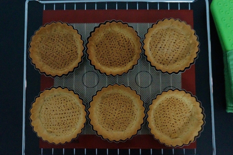 烤箱上火:180度,下火:160度预热,并用这温度烤甜挞皮,先烤20分钟,将入炉石连同油纸一起拿掉,再将甜挞皮放入烤箱烤10-15分钟,烤上色就可以出炉了(每家烤箱脾气不一样,记得多观察甜挞皮的上色程度喔)