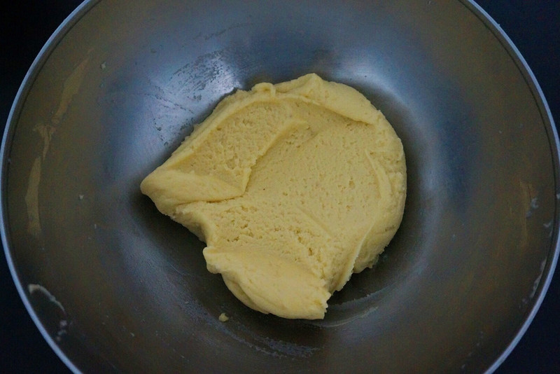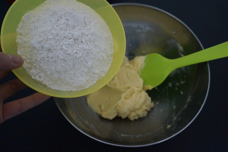 低筋面粉分两次倒入步骤六,用刮刀以切割的方式,切拌均匀,直到面粉湿润了,停止切割,再压拌的手法,检查面粉与黄油糊是否混合均