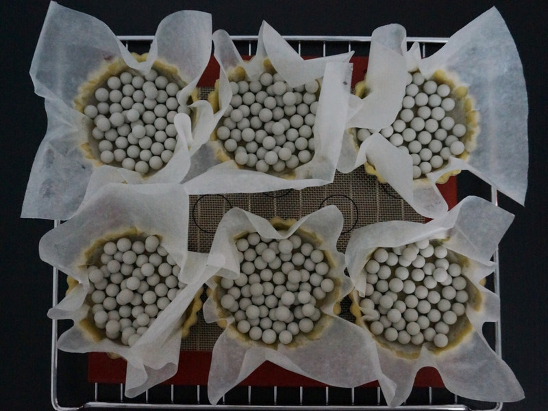 在每个挞模具上铺上油纸,里面放入炉石,避免烤的时候甜挞底部鼓起