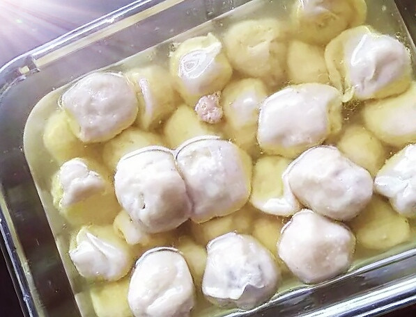 这是一道功夫菜,适合春、夏、秋季节做着吃,冬天洗好的面筋很难起粘性。