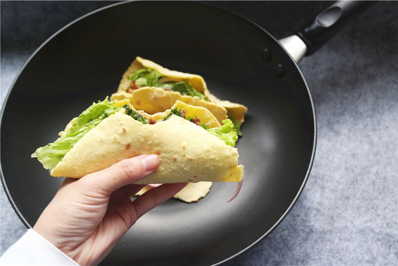 3、使用体验:在制作塔可的过程中有烙、煎步骤,这都是非常需要一把好的不粘锅来助力的。美亚干烙无油烟,特有聚能锅底导热均匀,另肉质鲜嫩多汁。一把好锅,不去墨西哥,就能吃到塔可的精髓