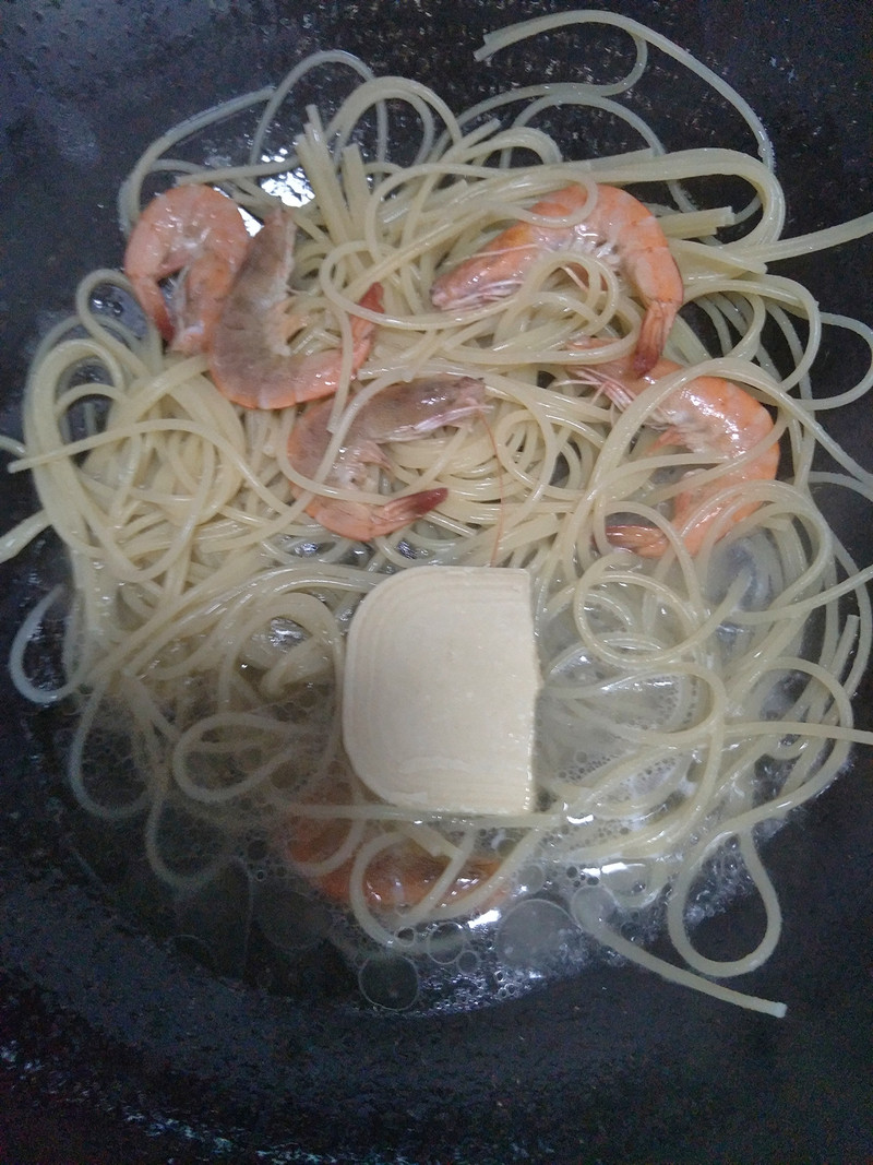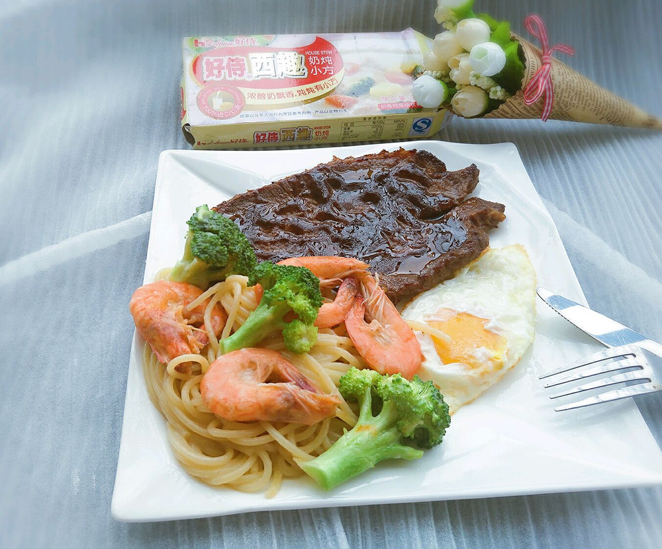 奶炖鲜虾意面配牛排的做法