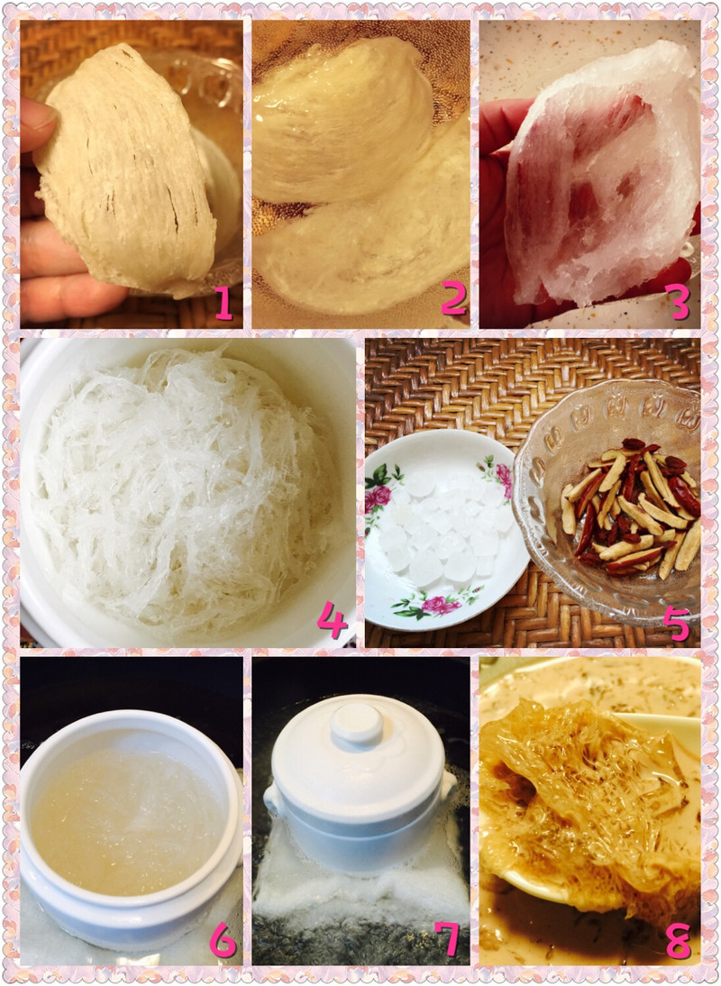 1.取一盏顶级盏撕开塑料膜,放在一个干净的大碗里,倒入纯净水泡发3-4个小时。 2.把手洗干净,泡好的燕窝会大2-3倍,然后用手顺着燕盏的纹路撕成一条一条,然后用镊子将其中的毛择净,如果嫌麻烦,如果你不是天秤座,这一步可以直接略过。 3.用纯净水冲洗3-4遍为宜,一定一定一定纯净水,自来水杂质太多,会破坏营养成分更不利于保存。 4.洗完了放在一个碗里,加入纯净水!纯净水!一定是纯净水,水刚刚没过燕窝就好,因为不是炖汤,要分几次吃的。在碗上盖上保鲜膜,没有套上保鲜袋也可以。 5.蒸锅清洗干净,加水,锅里这个可以是自来水。放上篦子,一定是隔着水蒸啊!!!开火盖上锅盖先把水烧开,开锅后把碗放进去,改中小火。(蒸锅里的水一定放足啊,中途不能加水的。) 6.40分钟后打开锅盖,掀开保鲜膜,把红枣和冰糖加进去,这个量就看个人口味了。然后盖上保鲜膜、盖上锅盖再蒸20分钟关火。晾凉后可放冰箱 7.如果当晚要吃,一般情况下7g左右的可以分两顿吃,每次用干净的勺子单独盛到一个碗里,剩下的放进冰箱。你可以热一袋牛奶,牛奶不要完全煮开,然后直接倒进碗里就行了。 ps:如果不喜欢牛奶,可可粉、椰奶、露露、果汁、水果,都可以的。一般是早上饭前吃,或者晚上睡前吃。燕窝的烹饪技巧