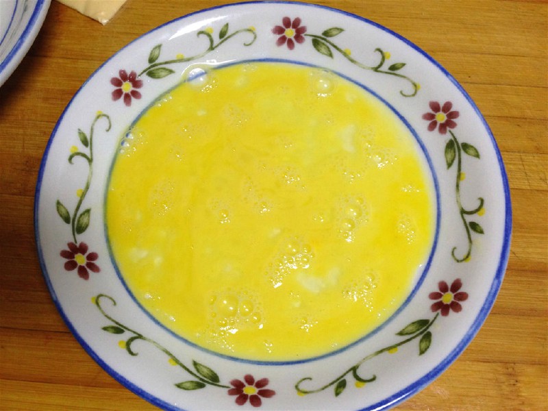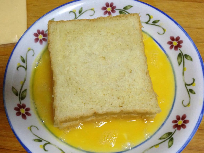 2、沾蛋液的时候,让吐司夹在蛋液中稍微停留下,让土司吸收更多的蛋液,吃起来蛋香味更浓。