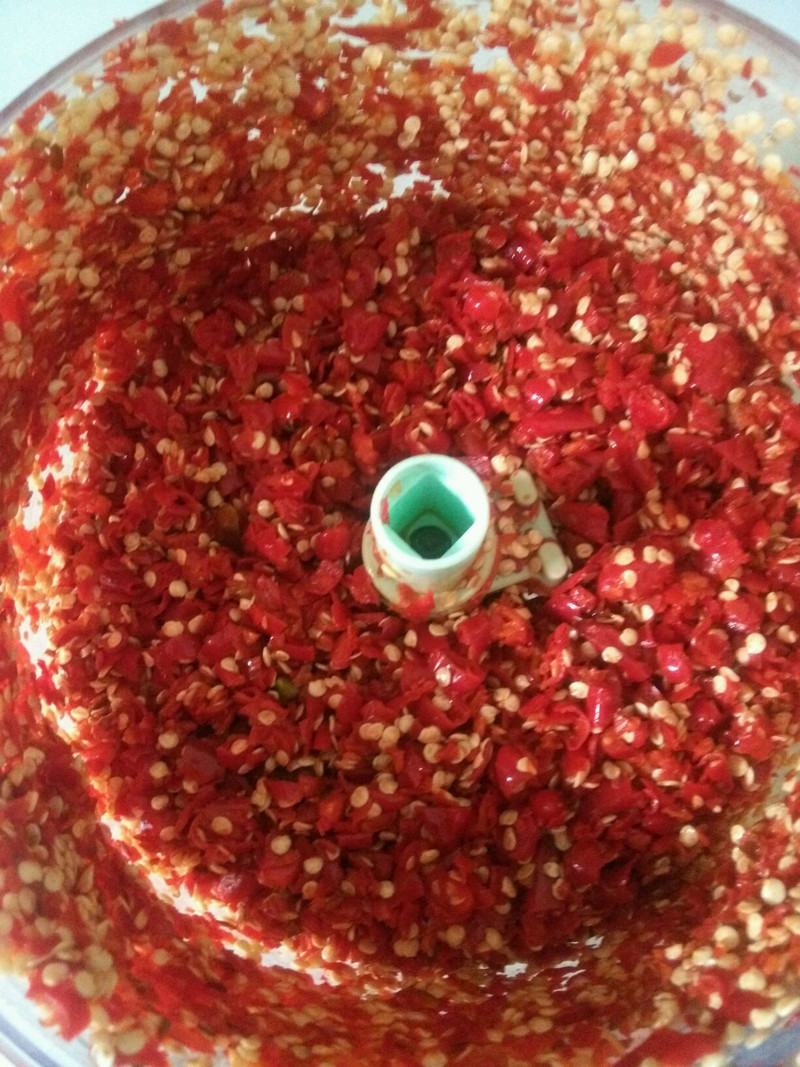 在做剁椒的过程中,所有的工具都必须保证无油无水。如果家里没有搅拌器,也可以用刀切,只是整个过程会慢些。菜谱里面用到的材料我都没过称,只是个大概。放少量白糖,不但可以中和它的味道,还可以防腐。