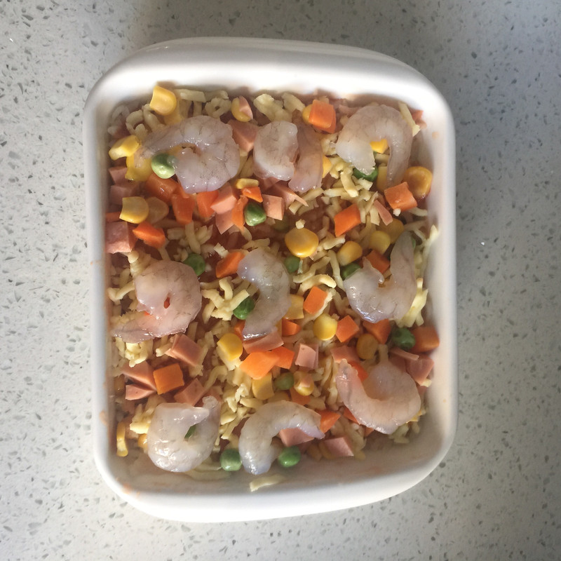 蔬菜发挥你的想象,青椒或黄瓜丁什么的、肉类放牛肉、鸡肉、培根都可以,前提是肉得炒熟。牛肉可以做成黑胡椒口味的,鸡肉可以做奥尔良口味的,肉如果是熟的,烤10分钟即可。因为我那个虾仁放之前是生的,所以就多靠了5分钟。