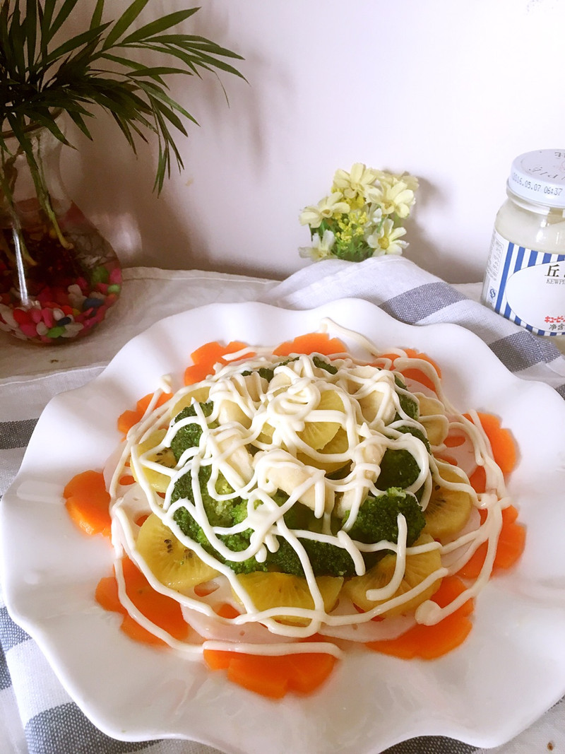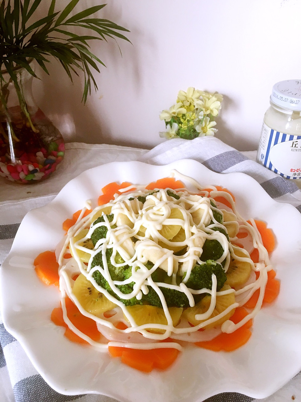 酸甜的水果(奇异果的酸、香蕉的甜),清香的蔬菜(艳丽的胡萝卜、清脆洁白的莲藕、翠绿诱人的西兰花),配上美味的丘比沙拉酱,清香中带有酸甜,酸甜中体味浓浓的酱香,口感的层叠享受,唇齿留香,让人回味无穷。