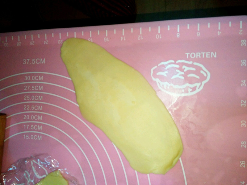 擀成牛舌形状后卷起来,继续醒发十分钟,十分钟后再取出继续擀成牛舌形状,继续卷起来(注意,面团只要没有入烤箱,就要用保鲜膜盖住,不然面皮很快就会干)