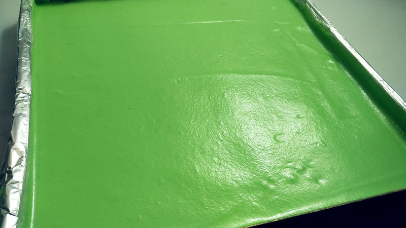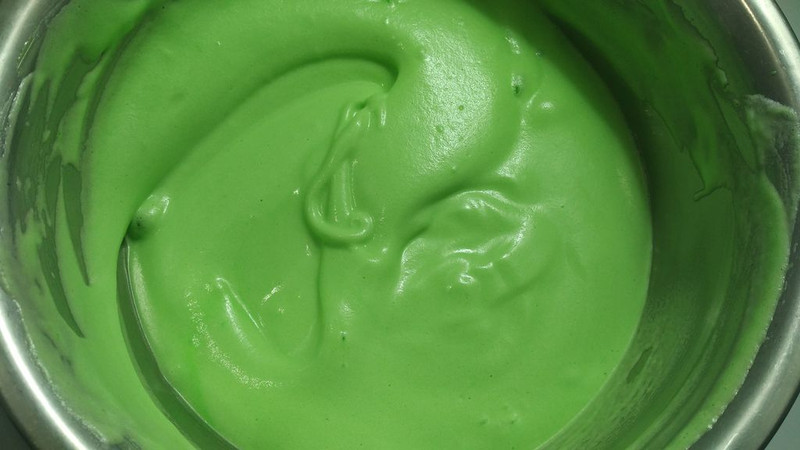 滴入4滴斑斓香精,继续用手动打蛋器搅拌均匀。搅拌好的面糊放在一旁备用。这时候可预热烤箱,180℃。 斑斓香精可以酌情加入,主要看颜色是否达到你的要求。 这里的斑斓香精没办法完全用菠菜汁来替代,浅色的西瓜皮蛋糕卷可以用菠菜汁来做,但是深色的花纹就没办法再继续加菠菜汁来调节颜色,所以只能加点色素。因此,做法可以是第一种用斑斓香精,第二种用菠菜汁+色素(抹茶),第三种用色素。