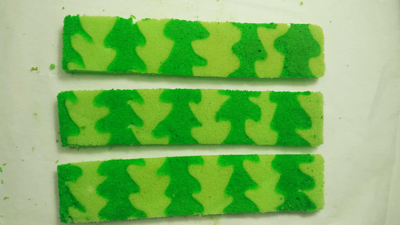 5.斑斓香精是东南亚常用的香料之一,新鲜的香兰叶汁还可以用来代替食物染色。这里的斑斓香精没办法完全用菠菜汁来替代,浅色的西瓜皮蛋糕卷可以用菠菜汁来做,但是深色的花纹就没办法再继续加菠菜汁来调节颜色,所以只能加点色素。