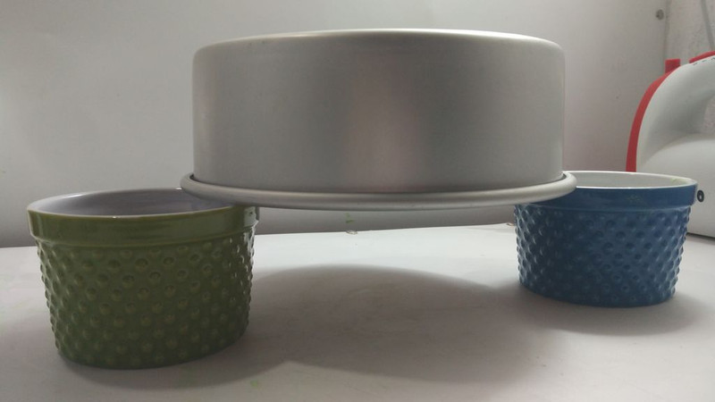 出炉后震两下,倒扣放凉。 蛋糕刚出炉时,内部还非常热,通过摔一下之后,可以震出里面的热气,内部冷却下来,这样可以防止蛋糕塌陷。 倒扣最大的原因就是防止塌陷。我喜欢把蛋糕倒扣在两个碗中间,这样中间是空的,更利于热气的散去,同时更起到下拉的作用。