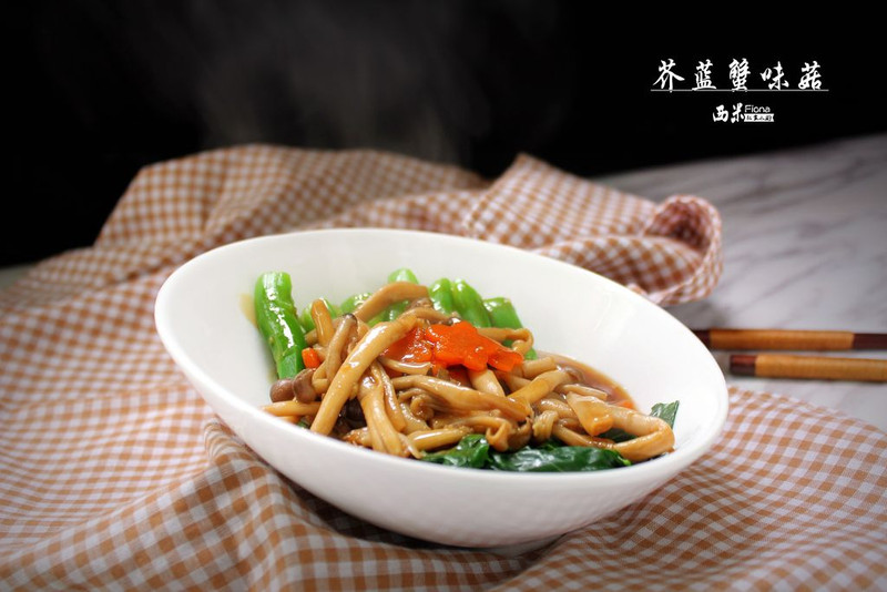 这会儿先来一道餐馆出现过的芥蓝蟹味菇吧。2块钱的芥蓝,3块钱的蟹味菇。1个胡萝卜增色,适量蚝油。简单的焯烫与蒸煮,就是一道口味极佳又富有营养的餐馆菜了。趁热吃啊。。烫汁不必收的太浓。可用来盖浇饭。保管你吃的美美的。