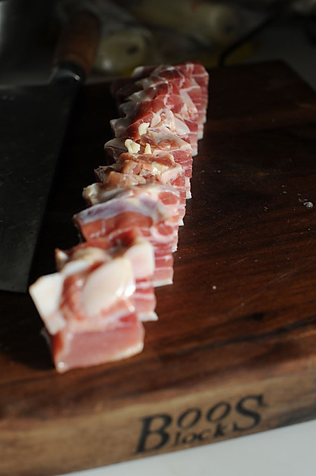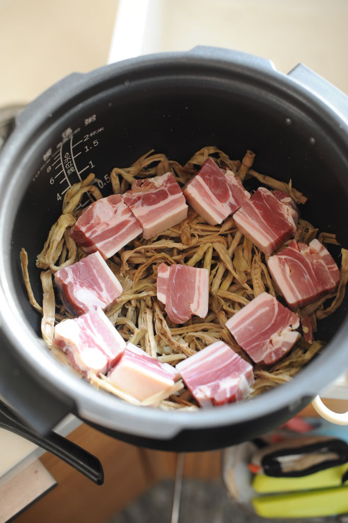 在苏泊尔鲜呼吸100压力锅的黑金球釜内胆中先铺入泡好的笋干,然后排入咸肉。
