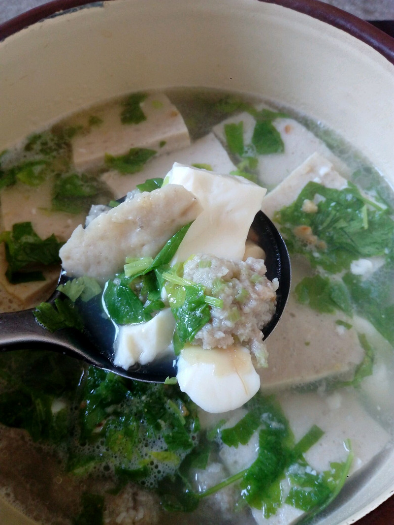 如果不喜歡肉餅或冬菜的小夥伴,可以把冬菜或肉餅去掉,不過切記豆腐湯里不可以加蔥哦