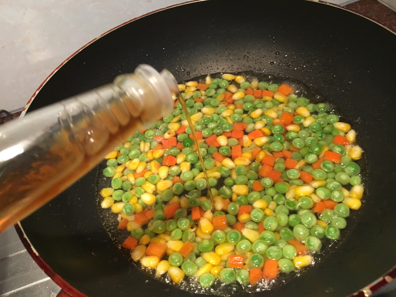 鸡蛋干做了圣诞塔后留下的边角料切成丁,和新出的豌豆仁,玉米仁、胡萝卜丁炒成一大碗,被我这个晚上不吃主食的人当饭吃了,鸡蛋干炒后又是另一番滋味,舔舔舌头想再来一碗。