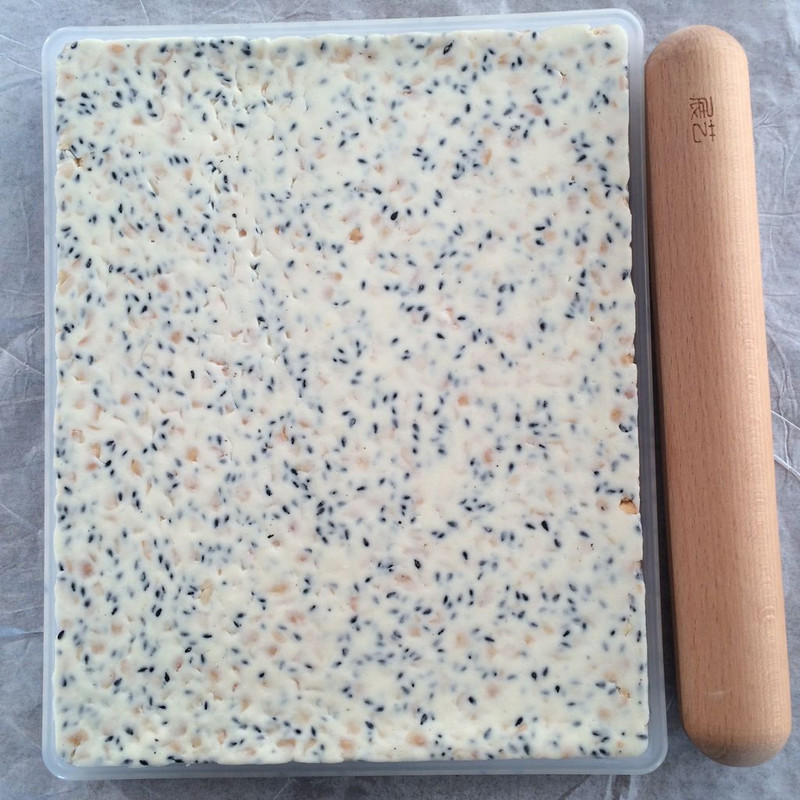 花生黑芝麻牛轧糖,入口香甜,有股浓浓的花生及奶香,而且越嚼越香。在中国古代,吃花生有带来长生的寓意。过年呀,亲手做一些牛轧糖来招待客人再好不过了。
