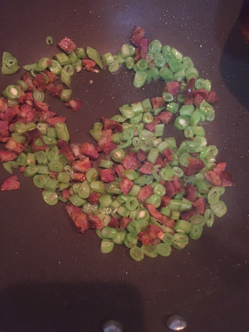 家里只剩下一小把四季豆,昨天吃剩的一根香肠,今天中午做个焖饭,美味!