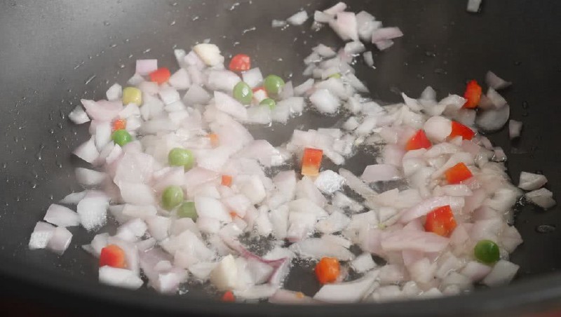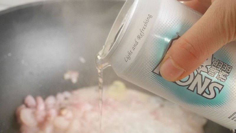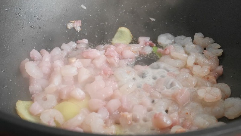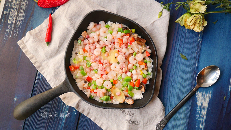 采用西班牙海鲜饭跟意大利烩饭相结合的方法,用橄榄油炒洋葱做基底,并将生米下锅和配菜,海鲜炒香再焖熟的方式,让米饭最大程度的吸收鲜美汤汁,一次加入足量的汤,避免翻搅最后完全收干汤汁,米饭吃起来是略微黏牙但是很有咬劲,而且是鲜死人的节奏