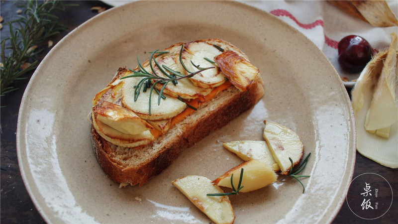 于是,平底锅里融一块黄油,少许蒜末炒香,冬笋切片,撒少许盐和胡椒,