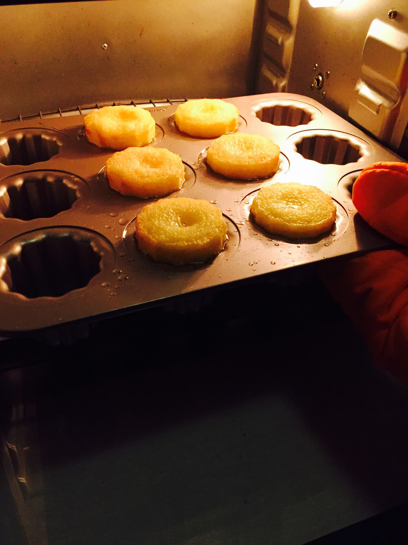 4、可露丽膨胀后要用隔热手套拿出敲打模具使其回落,避免出现白头