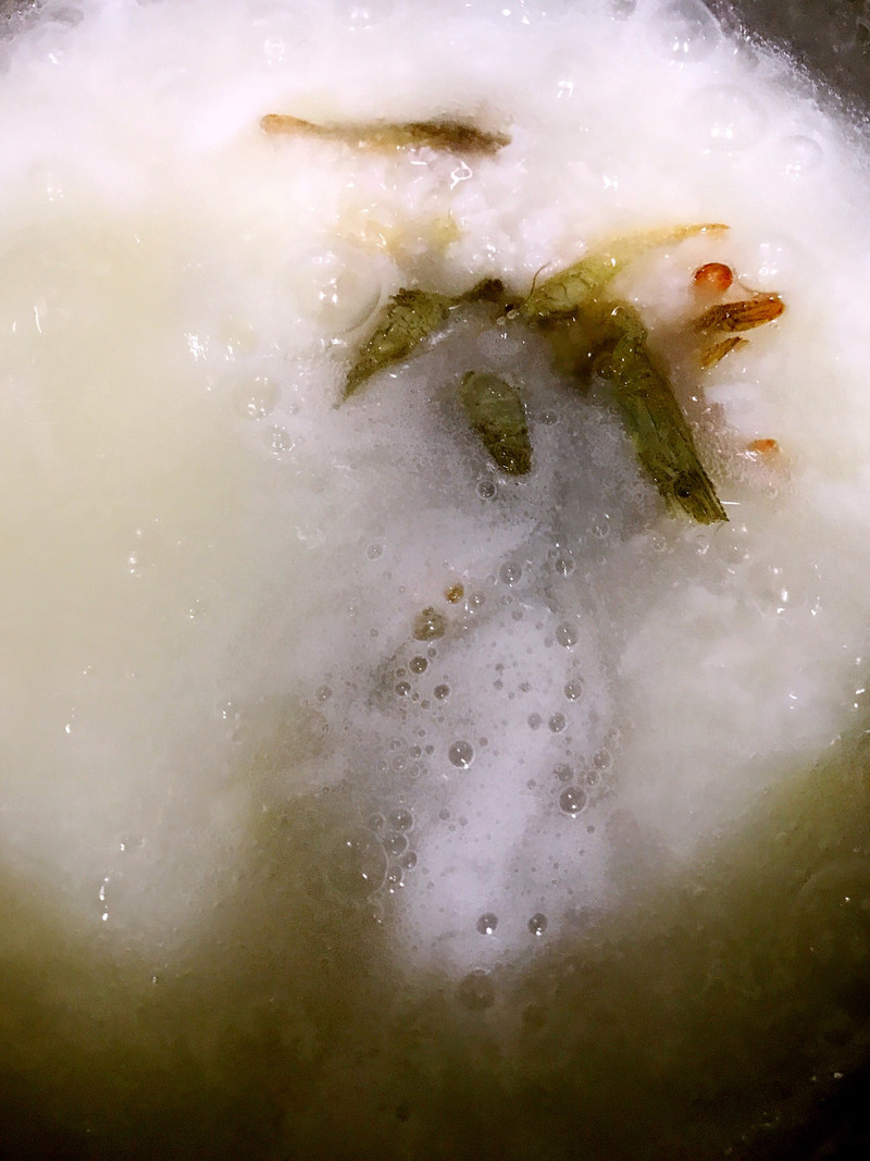 出粥米了!赶紧拿它来做顿海鲜粥!没想到意外的惊喜!不需要半途去打碎米粒,米粒很快就在翻滚后开花儿了,真是熬粥的好料!家常海鲜粥就是随手放点海鲜,没讲究,底料干贝是必备的!中午剩了一些河虾放进去了。味道鲜就对了!
