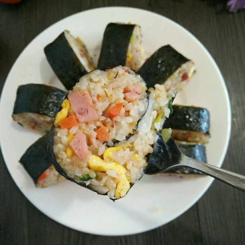 很不错的一道简单紫菜包炒饭,孩子很喜欢吃,天天嚷着要吃紫菜包饭,吃腻了白米包的今天就试试炒的包一下,哇,味道还真是不错,炒饭中夹着紫菜的香甜味道,棒极了