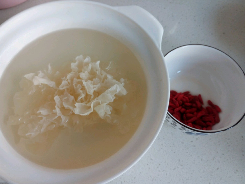 银耳用热水泡,发的快。银耳一次不要发太多,熟银耳放时间长,易产生亚硝酸盐。银耳用高压锅煮,能很快达到粘稠状态,节省时间。菠萝、枸杞后放,水果不用加热太长时间,保持营养。冰糖随个人口味添加。