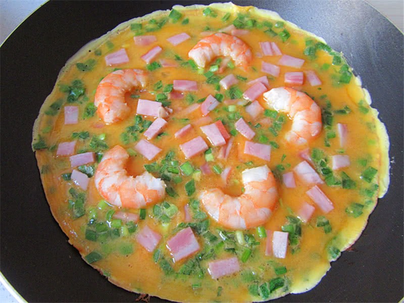 烙厚蛋饼很考验你的手艺哦,一不小心可就糊掉啦!注意按照果子的方法:平底锅预热,擦少许油,调至中火,分三次倒入蛋液,注意不用一下全倒完,这样分次可以让蛋液熟的快,而且在操作时候把锅拿起来慢慢摇晃,让蛋液滚成一块自然的大蛋饼形状,还不易焦糊,锅铲全程都可以不用一下哦